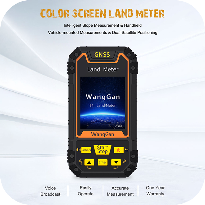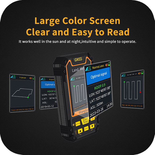- The color screen of the GPS land meter can display longitude and latitude, altitude, area measurement, distance measurement, land price calculation.